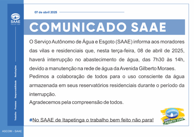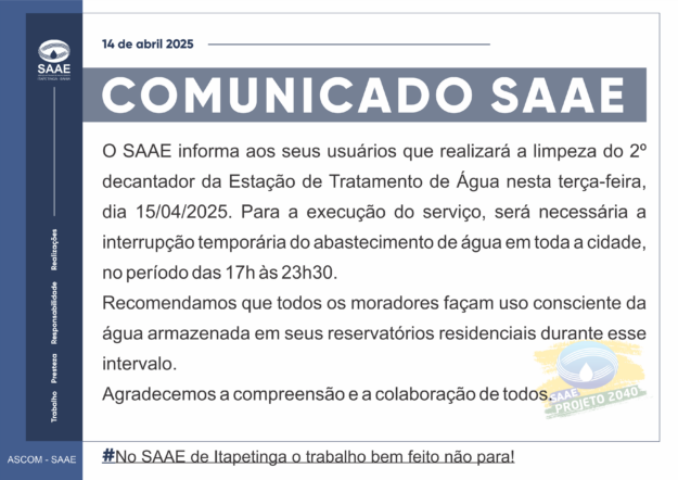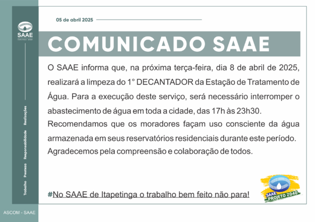“A limpeza dos decantadores é realizada trimestralmente ,com a finalidade de preservar a qualidade da água enviada aos filtros da Estação de Tratamento de Água,refletindo na eficiência da distribuição e mantendo as propriedades essenciais da água que chega aos nossos consumidores”