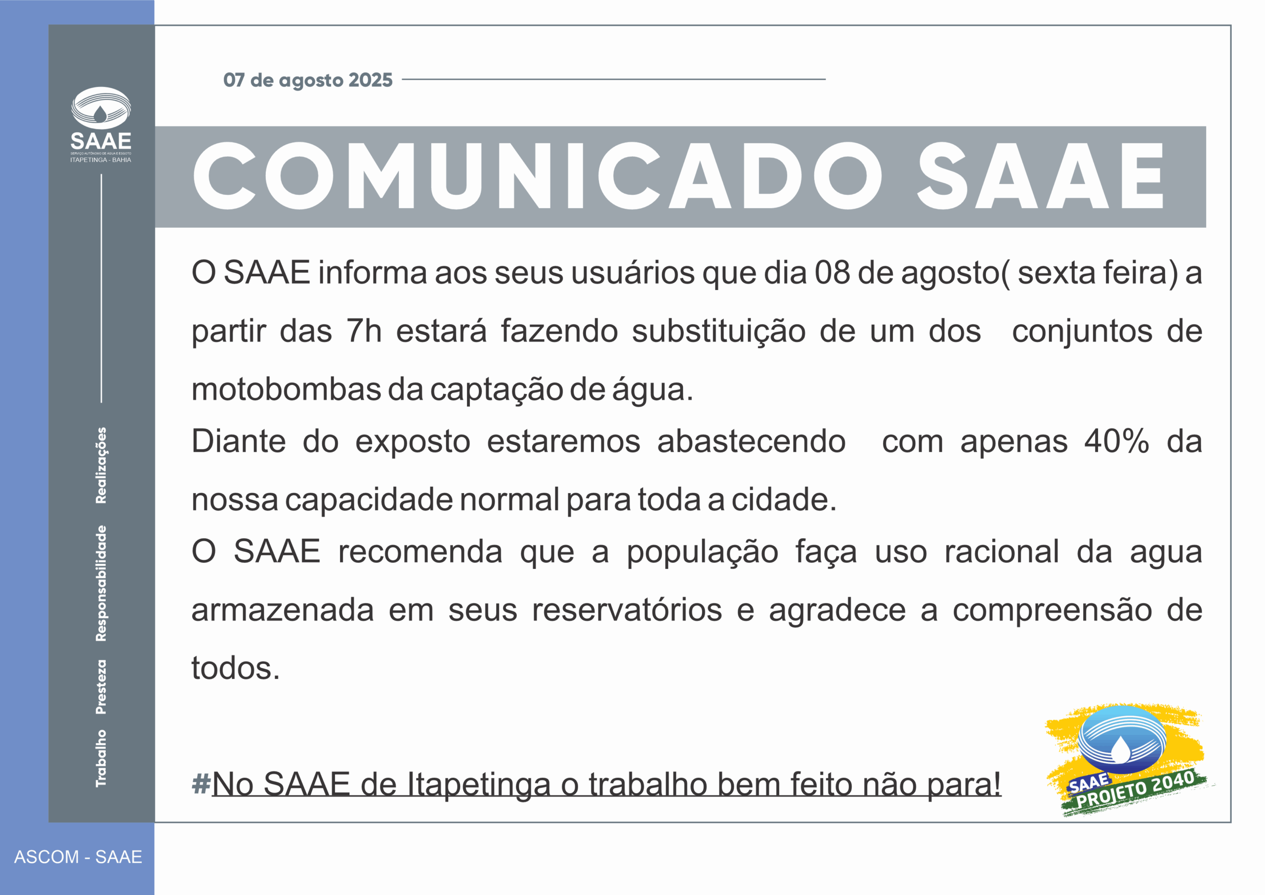 Category: Informe SAAEPor adminagosto 7, 2025 Autor: admin https://www.facebook.com/saae.itapetingaba Navegação de post:AnteriorPost anterior:Pregão Eletrônica nº 029-2025 | 18/08/2025 as 8:30hPróximoPróximo post:Dispensa nº 044-2025 | 07/08/2025Notícias relacionadasComunicado 27-02-2026fevereiro 27, 2026Comunicado 20-01-2026janeiro 21, 2026Comunicado 16-01-2026janeiro 16, 2026Comunicado 30-12-2025dezembro 30, 2025Comunicado 23-12-2025dezembro 23, 2025Comunicado 15-12-2025dezembro 15, 2025