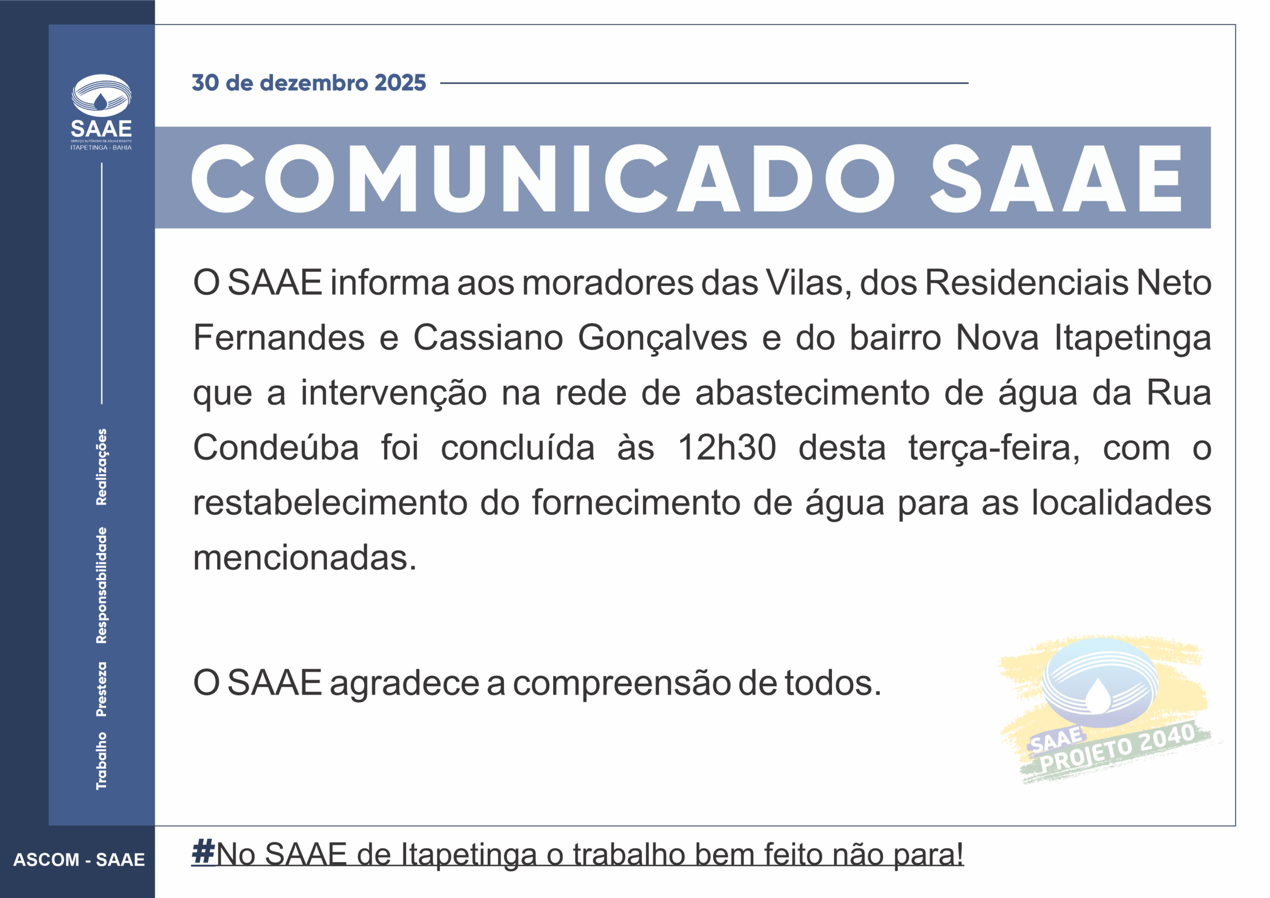 Category: Informe SAAEPor admindezembro 30, 2025 Autor: admin https://www.facebook.com/saae.itapetingaba Navegação de post:AnteriorPost anterior:SAAE CONTEMPLA OS SERVIDORES COM CESTA NATALINA EM CLIMA DE ALEGRIA E GRATIDÃOPróximoPróximo post:Inexigibilidade nº 01-2026 | 08/01/2026Notícias relacionadasComunicado 27-02-2026fevereiro 27, 2026Comunicado 20-01-2026janeiro 21, 2026Comunicado 16-01-2026janeiro 16, 2026Comunicado 23-12-2025dezembro 23, 2025Comunicado 15-12-2025dezembro 15, 2025Comunicado 09-12-2025-02dezembro 9, 2025